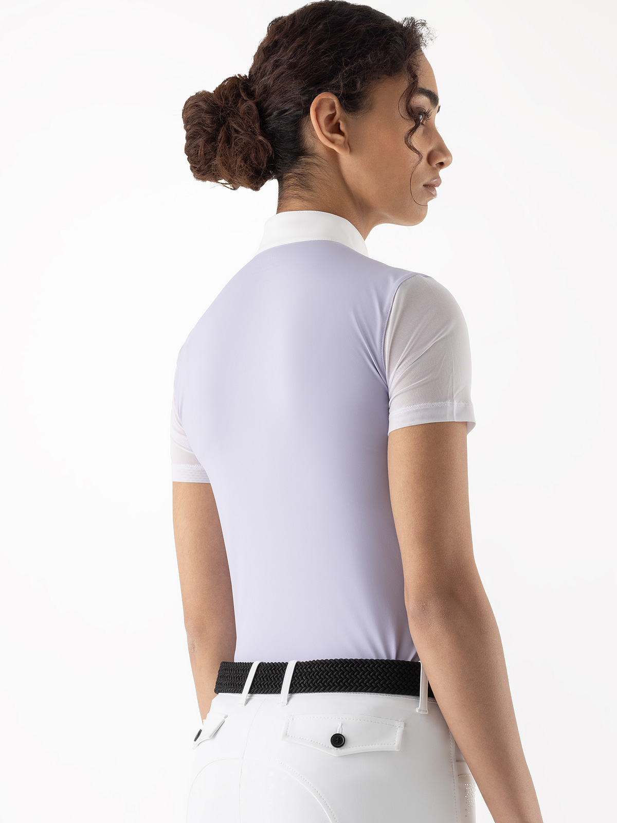 Where performance meets feminine detail. Made from stretch, breathable fabric, this competition polo features hidden snap buttons for a clean silhouette. The front placket is enhanced with elegant white plisse, while white stretch tulle on the sleeves adds lightness and style. A rhinestone logo on the collar provides a subtle, polished finish. Quick-dry technology ensures comfort in the saddle.